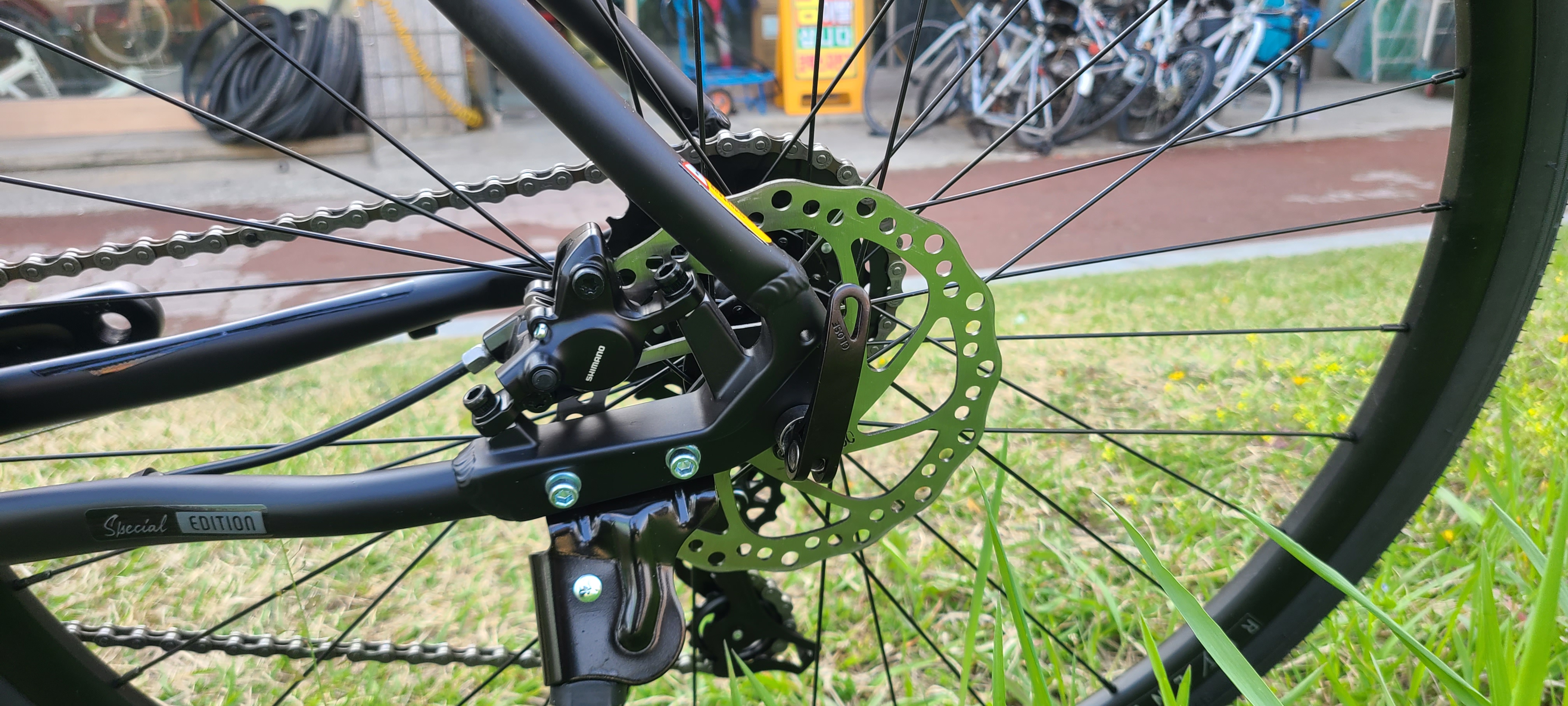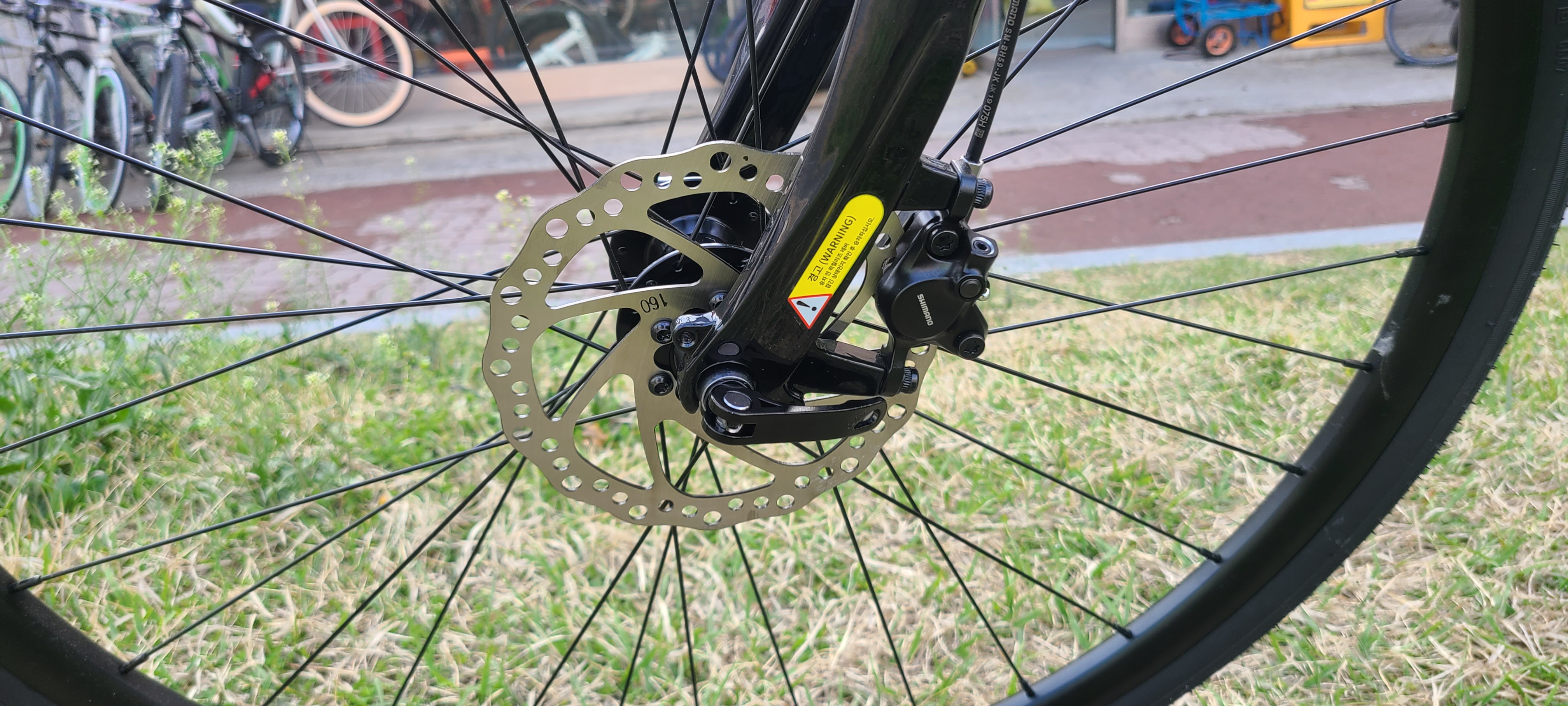 50만원 초반대 자전거답게 브레이크는 시마노 유압식 디스크 브레이크입니다. 시마노 브레이크는 산악자전거부터 생활 자전거까지 매우 다양하게 사용하며, 도심에서 사용한다면 충분한 제동력을 가진 브레이크입니다. 내구성과 수리성도 매우 좋아서 수리 시에 전국 어느 매장이든 주문 수리가 가능합니다.