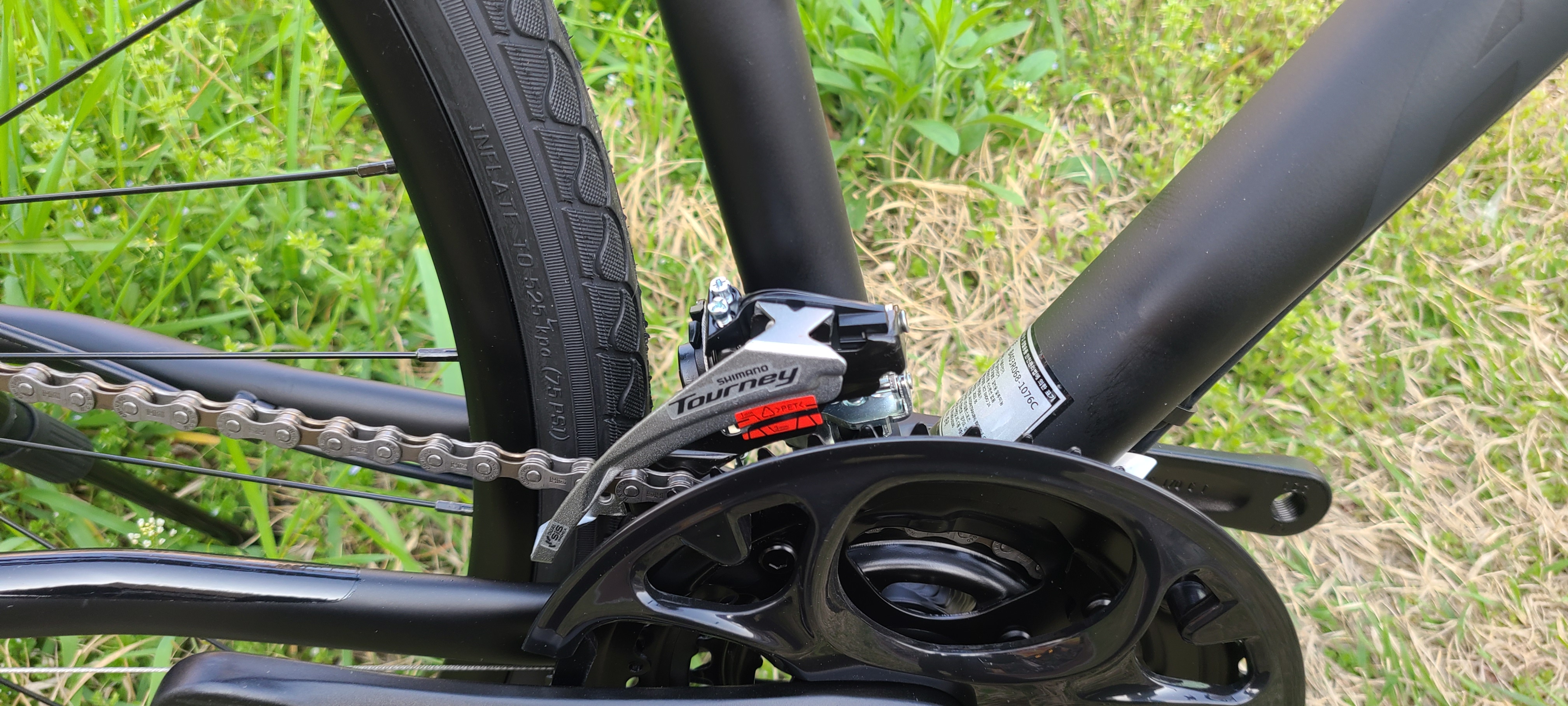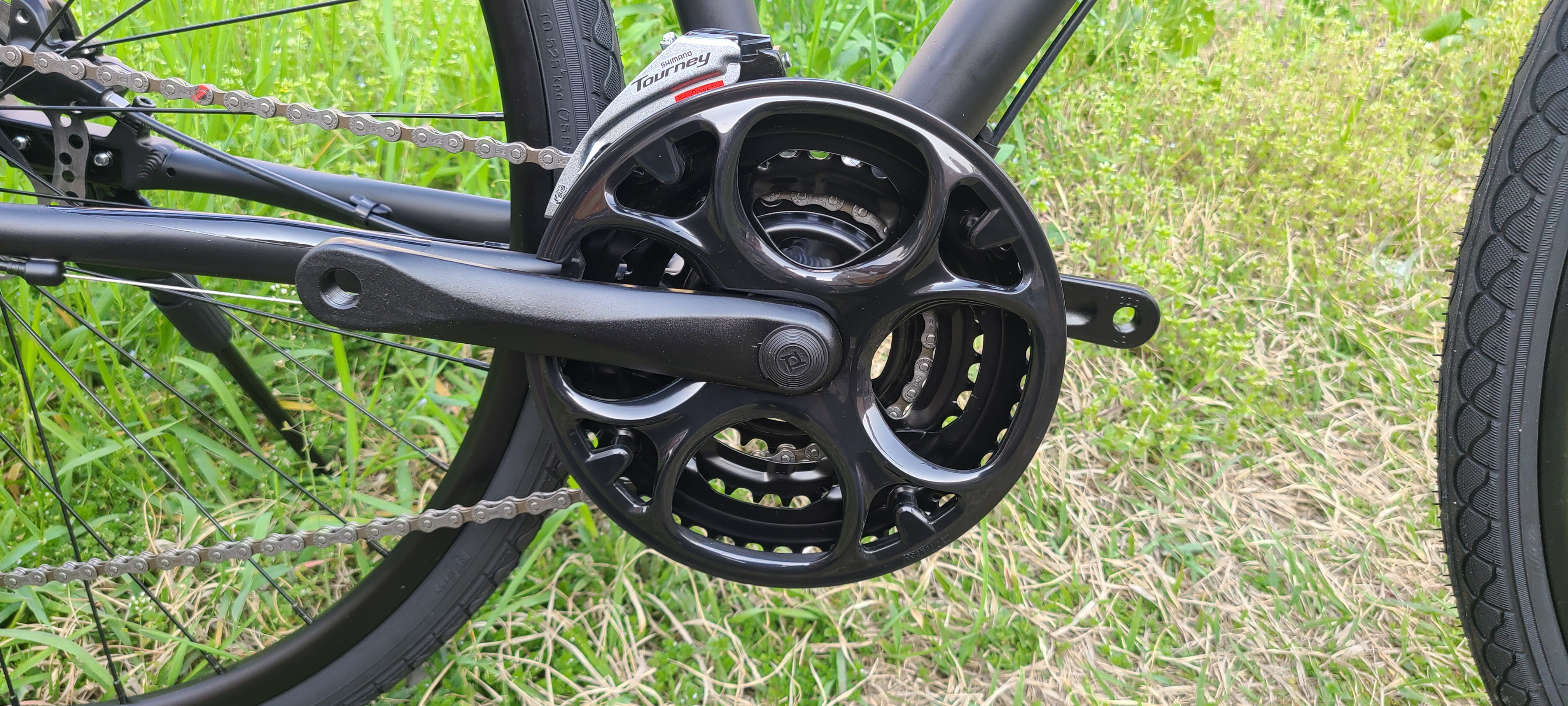 48/38/28T의 3단 크랭크와 12-32T 8단 스프라켓으로 총 24단 구성입니다. 도심에서 타기에는 충분한 기어비이며, 오라막길과 평지 모두 준수한 성능을 보여줄 수 있는 도심형 자전거입니다. 가벼운 산책, 등하교뿐만 아니라 운동까지 가능한 하이브리드 자전거입니다.